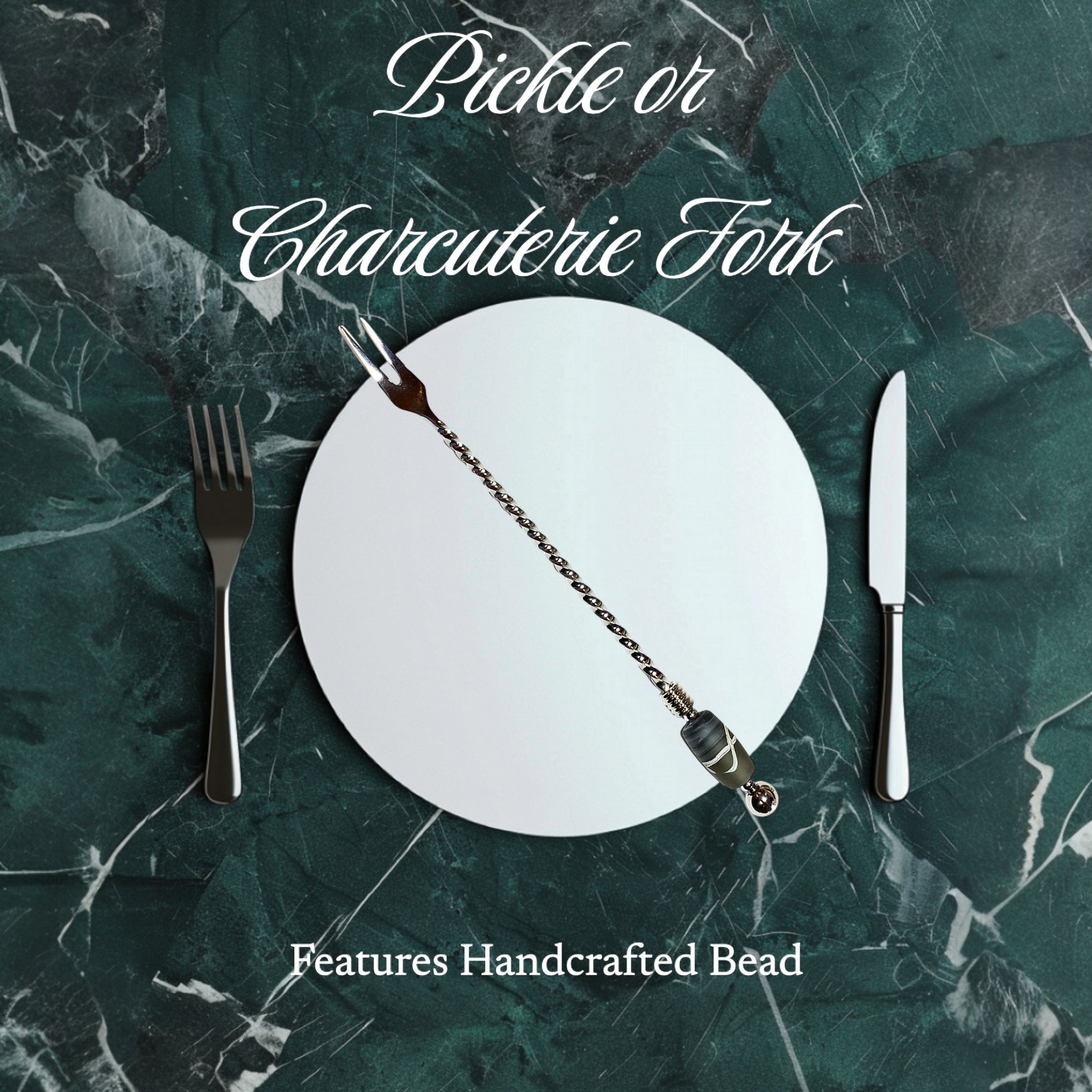 - #ArtisanCrafted #GlassBead #PickleFork #ElegantDesign #LongHandle #Handcrafted #FineCraftsmanship #GourmetUtensil #CheesePlatterAccessory #TableSettingElegance